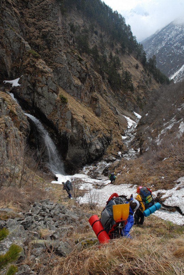 Подъем в 2.00/2.30. -2оС, небо затянуто, лишь отдельные просветы. Тихо, ветра нет, падают отдельные снежинки. Подморозило слабо. Выход в 4.10. От морены через ручей (под снегом) и вверх на седловину. Склон пологий внизу, вверху 20-25о. Ступени глубиной 20-30 см. Темно, фонари. Подъем в лоб. В 5.15 подошли под скалу, разделяющую склон на две части (фото 6). Светает. Скалу обошли слева, вышли на неё. Оттуда до седловины 50 м. В 5.50 вышли на перевал Уаза Западный (1А), высота 3318 м. Седловина широкая, тура нет. Погода хорошая (фото 7, 8). Нижняя граница облачности 4200 (вершина Лабоды скрыта). На севере сплошная пелена облаков. Спуск просматривается как пологий широкий снежный склон. Наст не держит, пойдем в снегоступах. Слева внизу на морене видно подобие тропы. В 6.30 начали спуск с седловины направо вниз траверсом до длинного широкого кулуара (фото 9). Он неглубокий, до 20о, забит плотным лавинным снегом. Идем по нему. Кулуар переходит в каньон. В 7.40 спустились к слиянию ручьев – истоков р.Элья. Отсюда направо вверх на морену уходит слабая тропа. Идем по ней до конца морены (фото 10). Тропа спускается вправо и уходит траверсом склона наверх через отрожек в долину Белягидона. Склон заснежен, со свежими следами лавин, освещен солнцем. Уходим вниз по каньону. Снова снегоступы. Много лавинных конусов. Каньон сужается, появляется вода (фото 11). Прижимы обходим траверсами по бортам. Крутизна 40-50о, травянистые склоны с камнями, редкие деревья, местами снег. Вышли к водопаду (на карте не обозначен). Обошли справа с набором высоты +50 м (фото 12). Скоро траверсы надоели (фото 13), идем по руслу. Много переправ (фото 14). В 15.45 вышли в долину Белягидона к кошу. Чуть выше коша в русле водозабор. Обед в точке 086, высота 2090 м (фото 15). Всё затянуто, морось. В 18.12 вышли с обеда вверх по долине Белягидона. Тропа, трава, пятна снега. Ниже тропы прорыты канавы для труб, видимо, водопроводных. Трубы полиэтиленовые, 150 мм. По пути перешли через левый приток (снежный мост). В 19.10 встали на ночевку в точке 097. Высота 2196 м. Туман, видимость 20 м, идет мокрый снег, +2оС. Пройдено 8,12 км за 2,44 ЧХВ, + 444 м, -1230 м.
