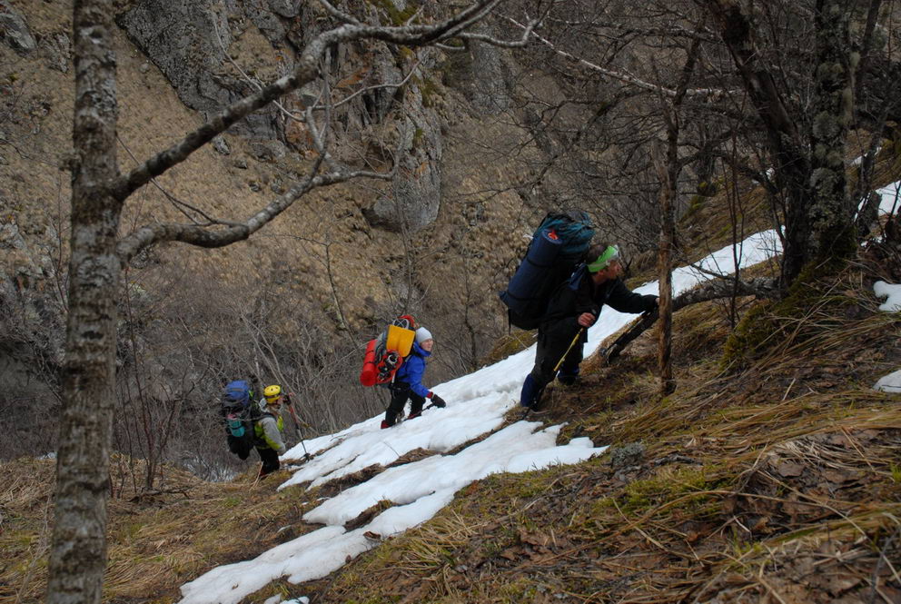Мы предполагали, исходя из опыта работы и походов в Приэльбрусье в мае, что снега будет немного, он будет подтаявший и осевший. Эти расчеты оправдались лишь частично. Зимние и весенние снегопады были обильными и сплошной снежный покров начинался с высоты 2200-2300 м. Поверх уплотненного снега лежал слой рыхлого, толщиной до 50 см, выпавшего незадолго до нашего приезда. Поэтому снежная обстановка была, скорее, зимняя, чем весенняя.