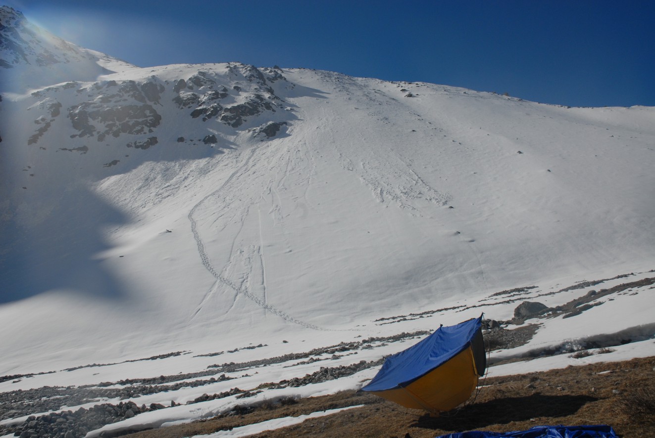 Подъем в 5.30/6.30. Ночью холодно, утром -5оС. Завтрак затянулся. Вышли в 9.00 (фото 4). К этому времени стало затягивать, облачность 10 баллов. На склонах видны свежие лавины. Идем в снегоступах. Снег пока держит, но, видимо, скоро его отпустит. В 9.40 дошли до впадения ручья из устья Уазы, обойдя каньон по левому берегу. Дальше идем вдоль русла этого ручья около 300 м ( до 20о) и выходим в висячую долину. Она широкая, с невысокими моренными грядами (фото 5). Идем левым берегом ручья, прокладывая путь по гребням морен (где меньше снега). В 11.00 все затянуло, видимость до 300м. Снег раскис, проваливаемся. В 12.10 встали на обед напротив перевала. До седловины по прямой 670 м. Все затянуто, видна только нижняя часть склона с лавинным конусом. Пока обедали, пошел снег. Видимости нет. Решили здесь заночевать. Точка 083, высота 3125 м. Тепло, 0оС, тихо, снег-крупа. За день прошли 2,95 км за 1,17 ЧХВ, + 401 м, -40 м.