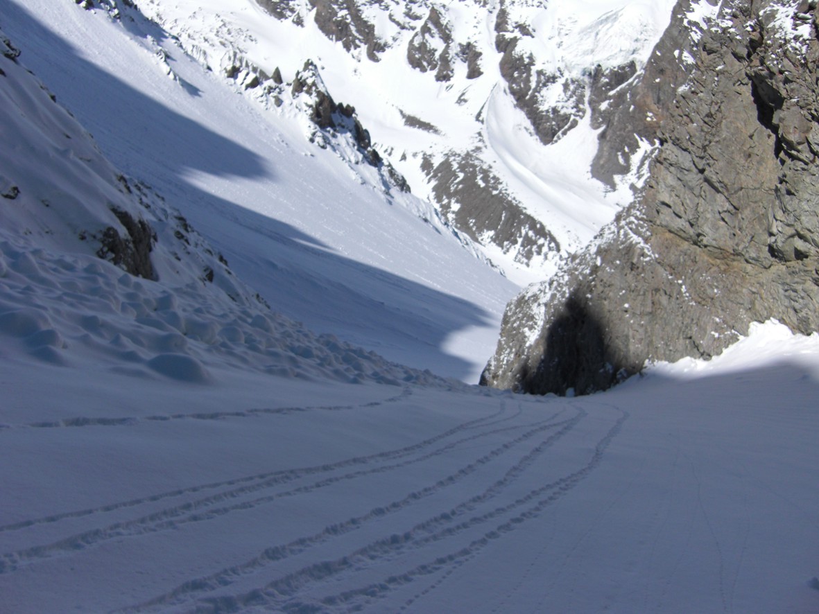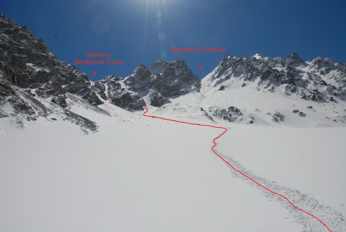 Ночью прояснилось и похолодало. Подъем в 4.30/5.00. Ясно, -10оС, на севере слоистая облачность, легкий ветерок с юго-востока, пробирает. На перевале в рантклюфте 2 озерца, но подход к ним затруднен. Выход на седловину сложен: одна веревка. Лед за зиму наполз на седловину, но вниз не стекает (фото 39). Видимо, летом все это стаивает. За ночь выпало около 8 см снега, наш путь почти замело (фото 40). В 7.15 начали спуск на седловину перевала Западный Суган (1Б), точка 160, высота 3374м (фото 41): 1 веревка через сераки до рантклюфта (кошки не одевали), дальше по камням на седловину, там площадка. Тура нет. Сложили свой, сфотографировались (фото 42). В 8.00 начали спуск с седловины. Осыпь и скалы, слабо прикрытые снегом (20-30 см), крутизной 30-40о (фото 43). Через 150 м подошли к месту разделения кулуаров. Пошли в правый. Снега много: лавинный, уплотненный. Крутизна 40о. Борта кулуара скальные. После поворота кулуара налево подошли к пробке: обошли ее слева по снегу. Через 80 м после пробки вышли к месту перехода в левый (фото 44), осыпной кулуар ниже его скального сброса (фото 45). Разведка показала, что можно продолжать спуск и по нашему (правому) кулуару (фото 46, 49), но левый положе, шире и сильнее забит лавинным снегом. В месте перехода нашли крюк (горизонтальный) и спусковую петлю из репшнура. Поправив его и добавив швеллер, завязали новую петлю. Спуск с перегибом: 8 м 60о и 15 м отвеса (фото 47). Дальше по снегу 30-35о вдоль стены до безопасной площадки. Спускались с рюкзаками, последний по двойной веревке с продергиванием. Пока спускались, мимо сошла небольшая лавинка из вчерашнего снега. Хорошо, кулуар широкий (фото 48). Дальше вниз по лавинному конусу прусским шагом. Уже проваливаемся, хотя солнце еще не осветило. Стало поположе. Одели снегоступы. В 10.50 спустились на морену ледника Рцывашки. Отсюда хорошо видна седловина перевала Западный Суган (фото 50), но путь движения по кулуарам снизу не очевиден. Также хорошо виден путь спуска с перевала Осыпной (фото 51). Очевидно, что на данный момент он очень опасен, так как пересекает лавиноопасные склоны под нависающими с гребня карнизами. На солнышке развязались и разделись – уже тепло. С левого борта долины постоянно сходят со скал небольшие лавины. ЧХВ спуска до ледника 34 минуты. В 11.45 пошли дальше вниз по моренам, затем вдоль русла до зеленки (фото 52). Путь очевиден, летом здесь тропа. Снег уже раскис. Тропим в снегоступах. В 12.44 вышли на зеленку (фото 53). В 13.32 в хорошем месте встали на обед, точка 161, высота 2224 м. Временами мелкий дождик. В 16.33 вышли с обеда вниз по коровьим тропам по правому берегу до леса. Дождь. В 17.35 справа остались развалины коша. В 17.50 встали на ночевку в точке 162, высота 1840м, на лужайке возле старого селевого русла. Летом может быть опасно при паводке. Вода, дрова. По спутниковому телефону заказали машину на 10.00 9 мая из Верхней Балкарии до Минеральных Вод за 3500 рублей. За день пройдено 10,3 км за 2,40 ЧХВ, +146 м, -1529 м.