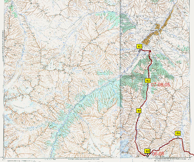 Подъем в 6.30. Пасмурно, тепло, +8оС. Выход в 8.10 вниз по тропе. Тропа до капитального коша идет правым берегом, затем от коша спускается к реке и по старому деревянному мосту переходит на левый берег. Дальше идет вдоль реки (река уходит в каньон) и траверсом выходит на хребет. Тропа конная. С хребта хорошо видно село Верхняя Балкария. Связь только Мегафон. С хребта тропа круто уходит вниз к реке у поселка (серпантин). В этом месте брод. Пешеходный мостик в 30 м выше (узкий, подвесной, старый, без перил) (фото 54). От мостика вышли на улицу вдоль арыка, через 150 м свернули влево на перпендикулярную и по ней вышли на дорогу в 100 м ниже моста и в 300 м от погранзаставы. У моста ждала машина. В 10.02 финиш в точке 163. За день пройдено 5,58км за 1,06 ЧХВ, +51 м, -600 м. За 3 часа доехали до Минеральных Вод (170 км). Дорога хорошая. В одном месте проверили документы у водителя, нас не трогали. Баня у вокзала оказалась закрыта. Оставили рюкзаки в камере хранения на вокзале и поехали в сауну (Гостиный двор у рынка дорого, у Стекольного завода 500 р/час со всех). После сауны посидели в кафе напротив Магнита (2500р/6 человек), купили продуктов и на вокзал. В 22.23 подошел наш поезд (Владикавказ – Москва).