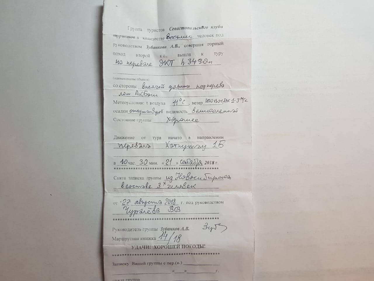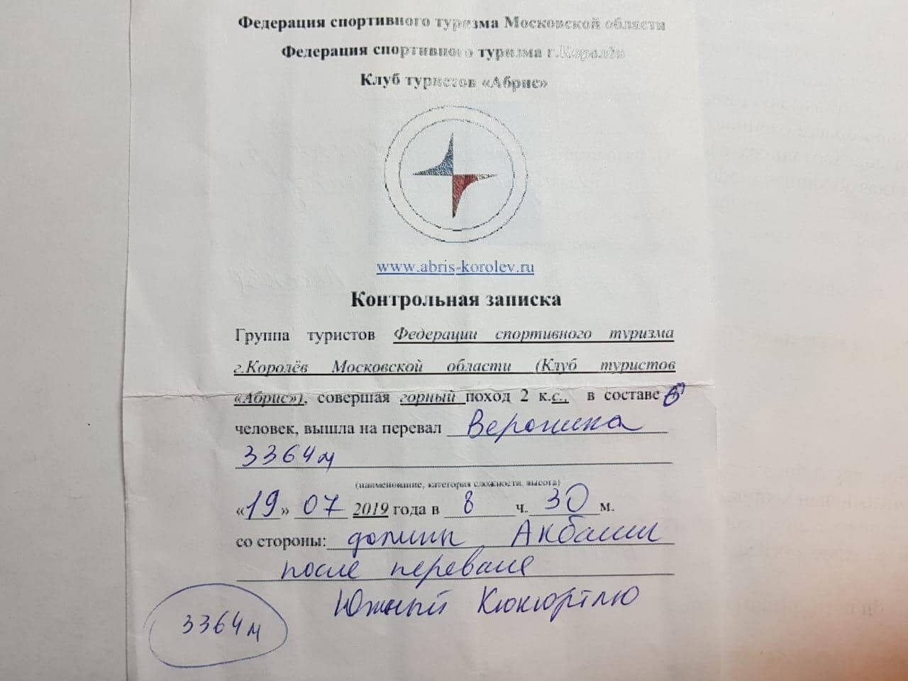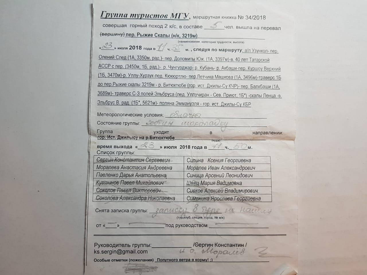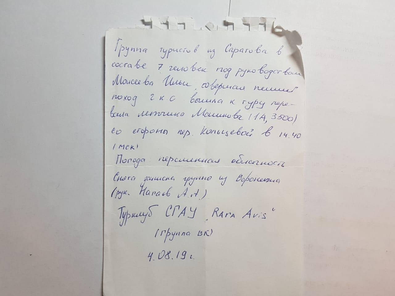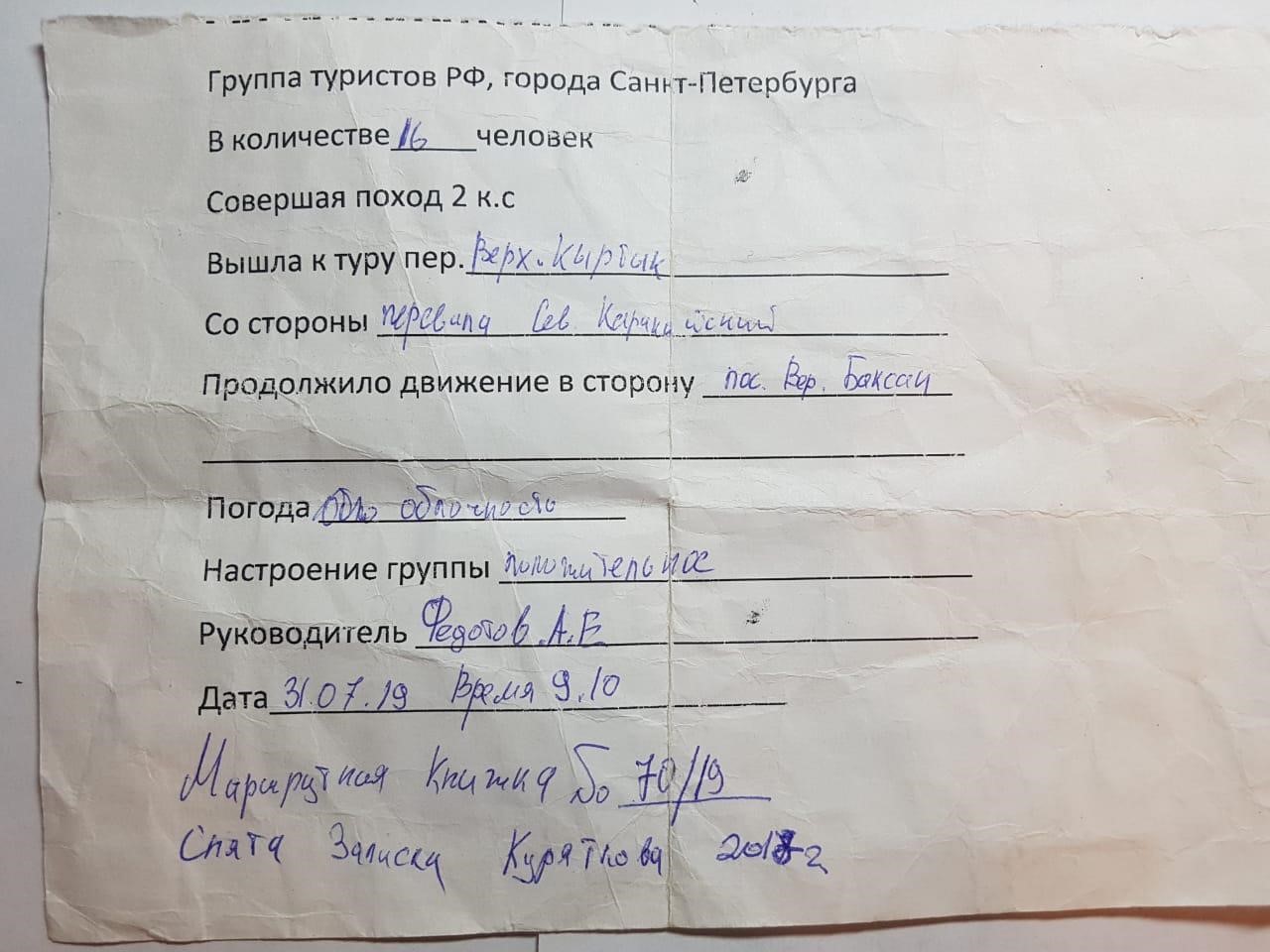 Перевал Летчика Машакова (1А, 3500м): снята записка группы туристов из Саратова, совершавших пеший поход 2 к.с. под руководством Моисеева Ильи от 04.08.2019, время: 14.40. Перевал Рыжие Скалы (н/к, 3219м): снята записка группы туристов МГУ, совершавших горный поход 2 к.с. под руководством Сергина Константина от 23.07.2018 г., время: 11.35. 7 августа. День 10. Подъём группы в 5.00, выход в 7.00. Утро встречает нас ясной погодой, доходим до р. Уллу-Хурзук и бродим её в кроксах по 1 человеку, течения с утра слабое, вода бодрящая. Выходим из русла реки, прямо перед нами виднеется начало тропы на перевал Кольцевой. Выходим на тропу и забираем по ней немного вправо 350 метров по тропе под осыпной взлёт по направлению к пер. Кольцевой. Перед взлетом делаем небольшой привал, т.к на нем самом останавливаться не хочется, N 43°21.238’ E 42°21.210’. Сам взлет имеет крутизну 30 градусов и перепад 150 метров. За 1 переход проходим его, наверху устраиваем привал. Наверху взлета находится развилка, вправо тропа уходит на перевал Лётчика Машакова, влево - на перевал Кольцевой. Сворачиваем влево на перевал Кольцевой, спустя 2 перехода по тропе выходим на широкую перевальную седловину с туром, N 43°21.995’ E 42°21.093’ время 10.00, ЧХВ от начала подъёма 2 ч 20 мин. Далее оставляем рюкзаки рядом с перевальным туром и одного участника, которому нездоровится, вооружившись палками, направляемся радиально в сторону пер. Летчика Машакова. Набираем 170 метров по высоте и выходим на верх хребта, проходим тур с высшей точкой и начинаем плавно сбрасывать высоту. Уже отсюда, сверху видна широкая перевальная седловина пер. Летчика Машакова, N 43°21.944’ E 42°22.010’. Фотографируемся рядом с памятной табличкой и собираемся обратно, возвращаемся по немного другому пути, без набора высоты. Идём вдоль высохшего озера с висячим ледником в середина хребта. Пахнет сыростью, почва под ногами мягкая. Обратное расстояние проходим практически без набора высоты. В 12.00 спускаемся обратно к рюкзакам. Далее обходим с левой стороны озеро, проходим родник и на площадках под палатки устраиваем обед. Погода начинает портиться, локальные вершины вокруг затягивает облаками. Пообедав, выходим продолжать наш траверс. Выше 3470 уже облако, идём в молоке по приборам, видимость 50-150м. В 13.45 часов выходим по тропе на безымянную седловину пер. Озёрный (1А 3450м), N 43°22.062’ E 42°20.586’, на ней находится огромный тур. С седловины движемся по хребту в сторону локальной вершины 3531 м, гребень широкий, под ногами средняя и мелкая осыпь, тропа то появляется, то исчезает. С вершины сбрасываем 50 метров по осыпи крутизной 20 градусов и оказываемся на перевале Озёрный-Кольцевой (3447м, 1А), N 43°22.469’ E 42°20.512’. Видимость падает до 50 метров, продолжаем двигаться плотной группой по навигатору. Набираем 80 метров далее по хребту до локальной вершины 3533м, под ногами средняя и крупная осыпь. Спуск с вершины на перевал Рыжие Скалы является ключом траверса. Склон с крупной осыпью, крутизной в локальных местах 30-35 градусов и перепадом высоты в 230 метров. Проходим по мокрым камням медленно и осторожно, стараемся не растягиваться и идём плотной группой в облаке. Склон широкий, имеет несколько выраженных осыпных контрфорсов, которые могут увести в другую сторону. В 15.00 часов оказываемся на перевале Рыжие Скалы, N 43°23.173’ E 42°20.314’, снимаем записку, фотографируемся в тумане и начинаем спуск с перевала в сторон
