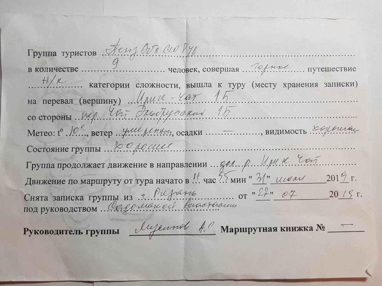 Вершина Чаткара (3898 м): снята записка группы туристов Клуба Путешественников «Странник» под руководством Баянтуева Евгения от 18.07.2019, время: 09.20. Перевал Ирикчак (1Б, 3667м): снята записка Клуба туристов «Абрис» г.Королёв, совершавших горный поход 2 к.с. под руководством Капарулина Е.В. от 25.07.2019, время: 08.00. После разбивки лагеря отправляемся на разведку пути к пер. Джикаугенкёз (3520 м, 1Б). Ниже по склону пересекаем боковой отрог в понижении, N 43°21.067’ E 42°34.669’ и оказываемся по другую сторону отрога от нашего лагеря, отсюда просматривается путь на пер. Джикаугенкёз (3520 м, 1Б), и места стоянок по пути классического подъёма на перевал от русла р. Субаши, расположенные внизу склона на песчаном пляже. 2 августа, день 5 Подъём в 5.00, выход в 6.40. Уже по разведанному пути огибаем отрог и выходим на широкую, пологую, травянистую полку, по краю полки читается тропа, через 850 метров от пересечения отрога выходим на основную тропу, которая идёт снизу на пер. Джикаугенкёз, N 43°21.224’ E 42°33.639’ (3520 м, 1Б). Далее уже по основной тропе вдоль ручья начинаем двигается в сторону перевального взлёта. Перед тем, как выйти на перевал, тропа пересекает осыпной бугор, за которым открывается вид на седловину перевала и на восточные склоны великана Эльбруса. Группа на перевале в 8.06. Сделав перевальные фотки, начинаем движение по скально-осыпному гребню в сторону в. Чаткара. Путь проходит с левой стороны гребня по ходу движения, правая часть круто обрывается вниз на ледовое плато Джикаугенкёз. Крутизна склона местами достигает 30-35 градусов. Пройдя промежуточную вершину, группа подошла к большому снежнику, который лежит на восточном склоне горы, N 43°20.941’ E 42°33.528’. Пересекаем снежник, уклон 15 градусов, и выходим на боковой отрог, который ведет в сторону пер. Субаши (3700 м, 1Б). Далее движемся вправо по средней и крупной осыпи крутизной 25 градусов в направлении в. Чаткара. Через 2 ч 10 мин от начала движения с пер. Джикаугенкёз группа в 10.33 стоит на в. Чаткара, N 43°20.764’ E 42°33.266’, 3888м. Спуск проходит по узкому гребню, крутизной до 40 градусов на локальных участках. В некоторых местах гребень становится действительно узким, приходится придерживаться руками за выступы скал, большинство крутых участков можно обойти слева по осыпи, есть как минимум один участок в 5 метров, где необходимо, придерживаясь за скалу, лазанием спускаться вниз. Через 1 час 35 минут от начала спуска группа выходит на широкую седловину перевала Ирикчат, N 43°20.684’ E 42°32.373’. Отдыхаем и устраиваем чаепитие, воду берем из снежника на северном склоне перевала. Отдохнув, движемся в направлении вершины Рыжий Бугор. Отсюда коммерческие группы переходят на Ачкерьякольский лавовый поток и совершают восхождения на Восточную вершину Эльбруса. На Рыжем Бугре связь ловит плохо, оператор Мегафон. В 100 метрах на спуске с вершины, на хребте, расположены укрепленные каменными стенками площадки под палатки, N 43°20.690’ E 42°31.959’. Здесь и решаем остановиться на ночевку. Воду берем ниже по хребту из ледникового ручья. Внизу хребта ближе к ручью имеются ещё стоянки, но они менее укрепленные и более открытые ветрам нежели те, на которых мы остановились Фотоматериалы: