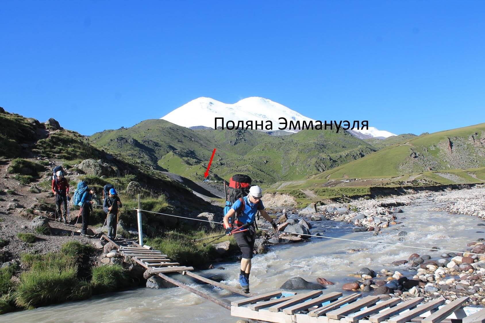 8 августа. День 11. Подъём в 5.00 утра, выходим в 7.30. Проходим бывшую базу МЧС, поднимаемся на тропу. Отсюда видно начало пути подъёма по отрогу до перевала. Через 500 метров тропа начинает уходить влево, огибая ручей, после ручья начинает набирать вверх по отрогу в сторону перевала. На высоте 3475 м влево отходит отрог, чуть ниже по нему находится перевал Восточный Чемарткол (3375 м). Подходя к перевалу, огибаем локальную вершину 3714 м с правой стороны, склон выполаживается, перевал находится в зоне видимости. За 4 перехода (3 ч 20 мин ЧХВ) от бывшей базы МЧС доходим по тропе до перевала БалкБаши, N 43°23.527’ E 42°24.197’, 1А 3689м, время 12.10. От базы МЧС было набрано чуть больше 1000 м, со средним уклоном 15-20 градусов. На склонах в округе находятся несколько отар баранов на выпасе, из коша снизу, расположенного рядом с бывшей базой МЧС. Перевальная седловина достаточно широка, но места под палатки находятся в сотне метров южнее по гребню. С перевала спускаемся вниз траверсом влево, вдоль склона, идёт отличная тропа, уклон в среднем 5-15 градусов, навстречу к нам поднимается несколько спортивных групп. Первые стоянки находятся на высоте 3500м, в 900 метрах от перевала, N 43°23.745’ E 42°24.763’, вода берется из ручья рядом. Далее тропа всё также идёт по склону вдоль Западного ребра. Всё это время тропу сопровождает уже знакомая нам синяя разметка. На высоте 3200 метров, разметка уходит с тропы вправо, N 43°24.852’ E 42°25.460’ мы уходим за ней, пересекаем ручей и далее продолжаем спускаться в сторону русла реки Кызылкол. Через 1100 метров от нашего ухода с тропы, разметка снова нас выводит на неё, уже рядом с рекой, далее проходим по тропе 150 м, и выходим к натянутой на шлямбурах навесной переправе для соревнований, в месте разлива реки, N 43°25.288’ E 42°26.071’. Радуемся. Одеваем верхние обвязки, кроксы и каски, по 1 человеку, пристёгиваясь к перилам усами самостраховки, с рюкзаками переходим реку, держась за перила. После переправы устраиваем обед на просторной полянке у реки с большими песочными площадках под палатки, в 50 метрах от переправы, N 43°25.309’ E 42°26.111’. Время 14.00 часов. Оглядываемся на мощный ледники Уллучуран, стекающий с северного склона г. Эльбрус и понимаем, что основная часть маршрута практически закончена. Впереди нас ждёт днёвка на Поляне Эммануэля. Пообедав, в 15.00 часов выходим. Продолжаем движение по разметке, набираем на ближайший склон морены, спускаемся с другой стороны и идём вдоль живописного заболоченного ручейка. Через 300 метров ручей пересекает тропа, которая ведет на поляну Эммануэля, через 650 метров тропа перерастает в старую геологическую дорогу, движемся по ней. Проходим по дороге живописнейшие луга под названием урочище Ирахиксырт. В некоторых местах основную колею дороги сильно размыло, поэтому параллельно идёт другая дорога. Привалов не делаем, продолжаем спускаться по тропе, справа вдалеке виднеется немецкий аэродром, постепенно склон становится немного круче, и мы видим саму Поляну Эммануэля. Перед спуском к поляне, крутизна склона увеличивается местами до 20 градусов, но это небольшой участок, который находится перед мостом через речку, которая впадает в Кызылкол, рядом с самой поляной. Мост, на поляну Эммануэля, N 43°25.702’ E 42°30.488’, с дороги не виден, он расположен за склоном в том месте, где геологическая дорога и река поворачивают к кошу, или практически у начала «оп