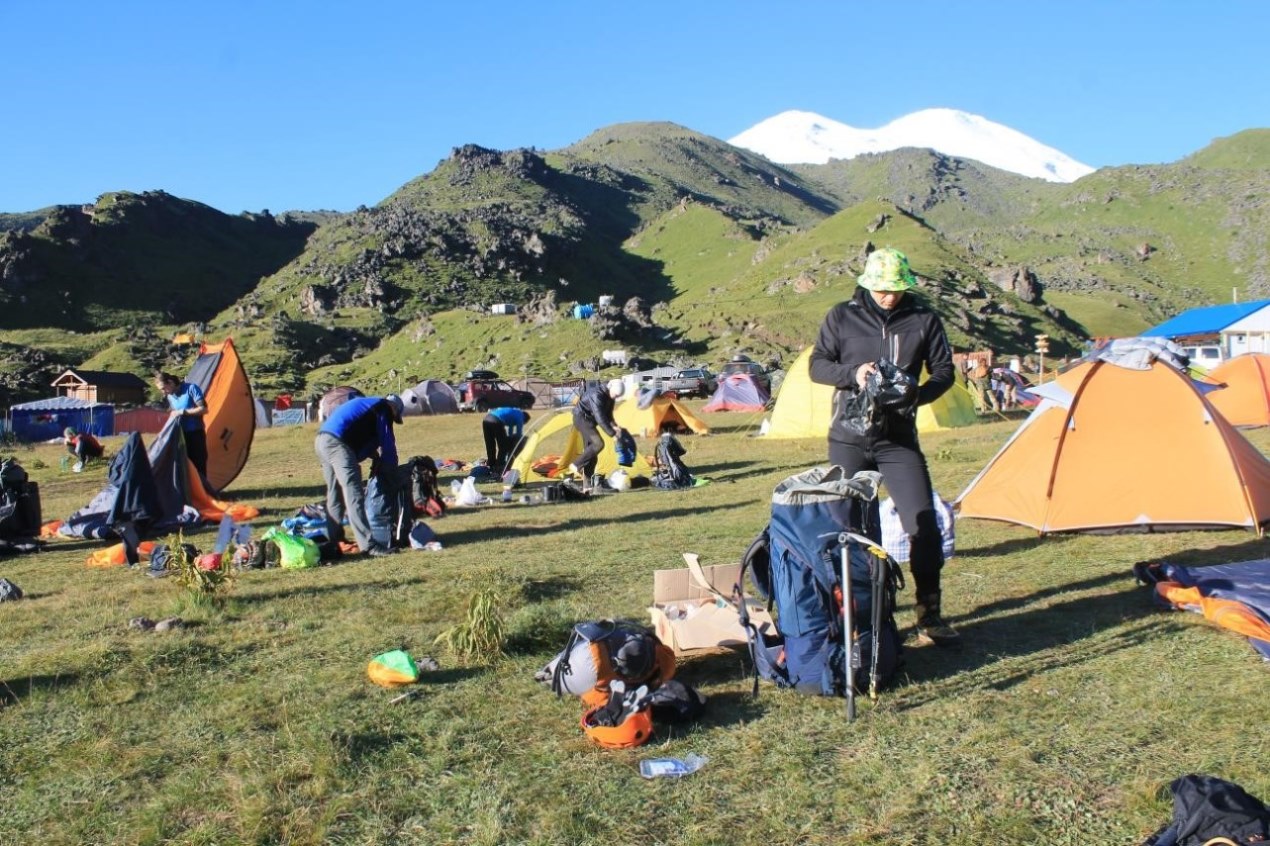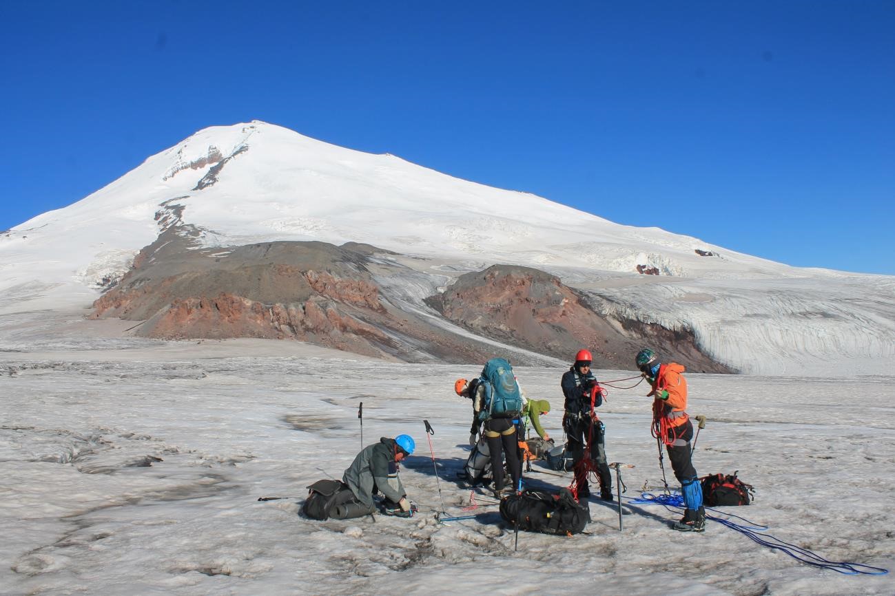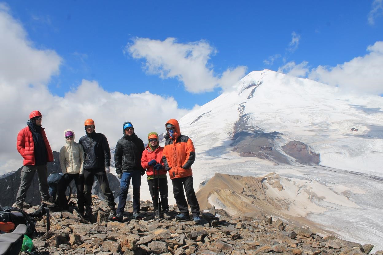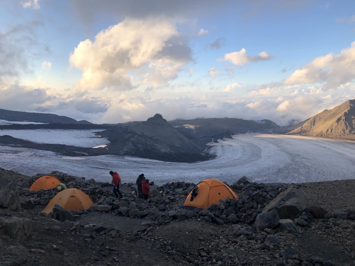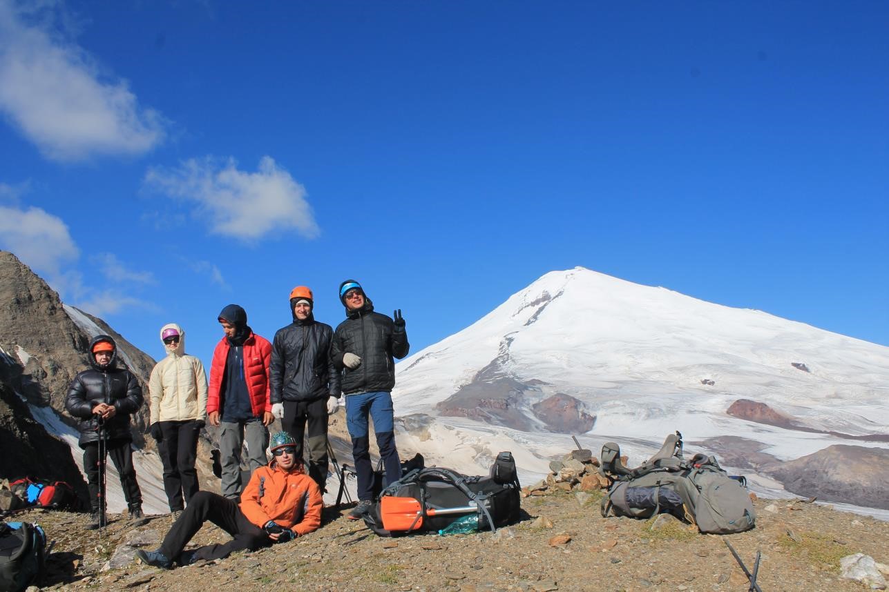 3 августа, день 6. Подъём дежурных в 4.00 утра, завтракаем и выходим в 6.20 утра. Спускаемся по хребту мимо ручья и стоянок там, где хребет выходит на один уровень с ледником, переходим на ледник. Поначалу ледник открытый, идём без связок в сторону Ачкерьякольского лавового потока. С приближением к потоку начинают появляться снежники, некоторые трещины становятся закрытыми. Не доходя до потока 1 км, принимаем решение связаться. Далее движемся вдоль лавового потока по левую от него сторону. Набираем высоту 4150 метров и проходим бергшрунд, N 43°20.367’ E 42°29.354’, чтобы оказаться выше скальных выходов, которые разрезают ледник. Выйдя на уровень 4150 метров, движемся траверсом вдоль восточного склона Эльбруса. Периодически попадаются закрытые трещины, участники два раза проваливаются по пояс. Примерно через треть пути открывается вид на скалы Спасателей, расположенных рядом с Приютом 11. Ниже, на высоте 3750 м, ледник хоть и выполаживается, но очень сильно разорван, в отличии от нашего пути по склону, в основном на склоне трещины попадаются не часто, их хорошо видно, ближе к Приюту 11 трещины становятся более открытыми, но ситуация меняется год от года. В 12.30 выходим на основную тропу, по которой совершают восхождение с юга, N 43°19.254’ E 42°27.619’, высота 4250 м. Весь путь занял 6 ч 40 мин (5 ч 20 мин ЧХВ), пройдено 7.5 км Спускаемся до приюта Орлиное Гнездо, высота 4070 метров, где останавливаемся на ночлег, N 43°18.915’ E 42°27.554’. Сушим обувь и носки, на ужин нас ждут хычины и сладости из заброски. Стоимость проживания в приюте составляет 1000 руб. с человека, в данную сумму входит: личное спальное место, сушка вещей, чистый туалет, просторная столовая и газовая плита, на которой можно готовить. За отдельную стоимость хозяйка приюта может приготовить хычины, горячий кофе и прочие блюда, указанные в меню. 4 августа, день 7. Подъём в 5.00 утра, завтракаем и выходим на акклиматизационный выход до верхних скал Пастухова. Надеваем на себя теплые пуховки, т.к. ветер более 30 км/ч. Без остановки за 1 час доходим до высоты 4800, любуемся видами на ГКХ 5-10 минут и спускаемся в приют. Второй раз завтракаем хычинами и выходим в 10.30 в сторону канатной дороги. С утра дорогу на спуск уже стало растапливать, снег превратился в кашу. Многочисленные снегоходы и ратраки романтики не добавляют. Фотоматериалы: