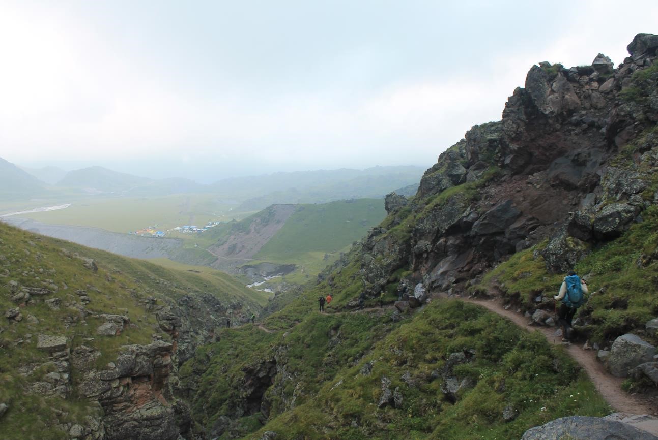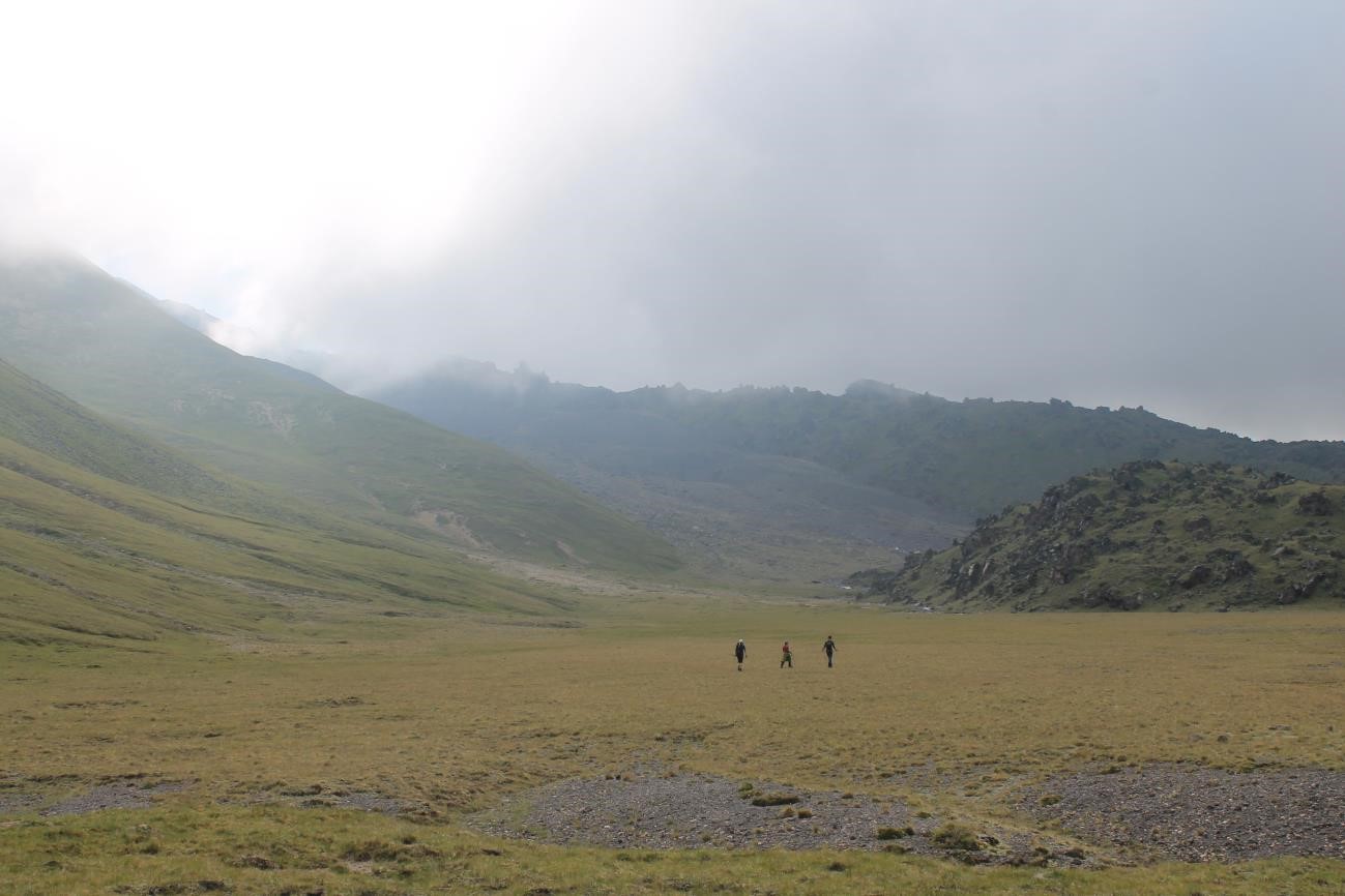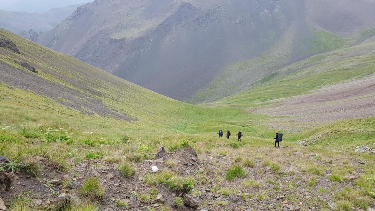 Пообедав и собравшись, пересекаем реку Исламчат, перепрыгивая по камням (часть участников в кроксах, часть - в ботинках), и начинаем подъём по долине в сторону пер. Кыртык Нижний. Долина условно состоит из трёх ступеней, на нижней ступени находятся ровные песочные площадки под палатки (N 43°24.524’ E 42°36.339’, 2680 м), вода из ручья рядом. Пройдя от площадок 300 м по высоте, останавливаемся на второй ступени (N 43°24.504’ E 42°36.577’, 2814 м), ручей выходит ниже по склону, делаем свои площадки и становимся лагерем в 15.40. 31 июля, день 3 Ночью была гроза с сильным ливнем, к утру распогодилось. Подъём в 5.00, выход в 7.00. Поднимаемся по траве на третью ступень и по конгломерату в 7.30 выходим на перевал Кыртык Нижний, N 43°24.383’ E 42°37.143’, 3110 м. В 7.45 начинаем спускаться с перевала по тропе, через некоторое время тропа теряется, и мы идём по травянистому склону, выходим траверсом на осыпь, чтобы избежать потери высоты, в сторону перевала Кыртык Верхний. Фотоматериалы: