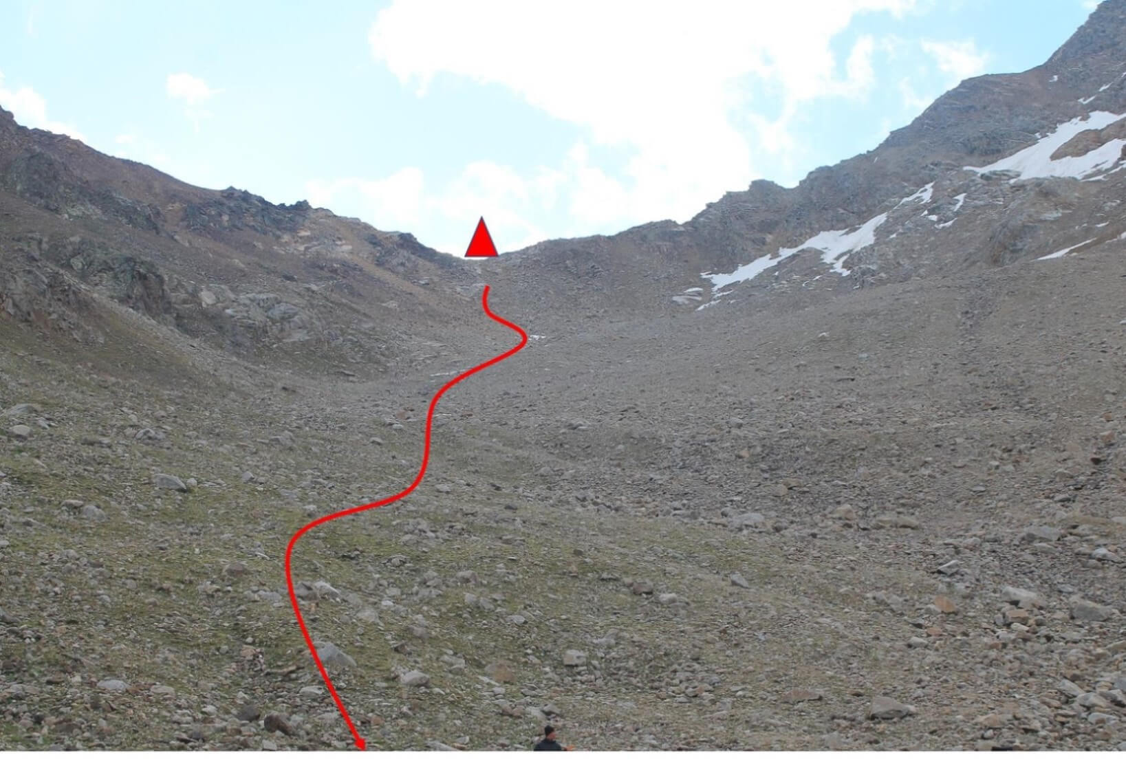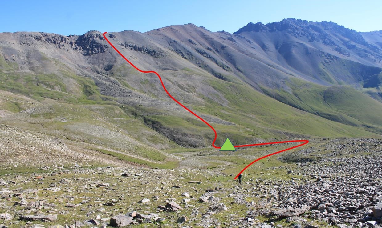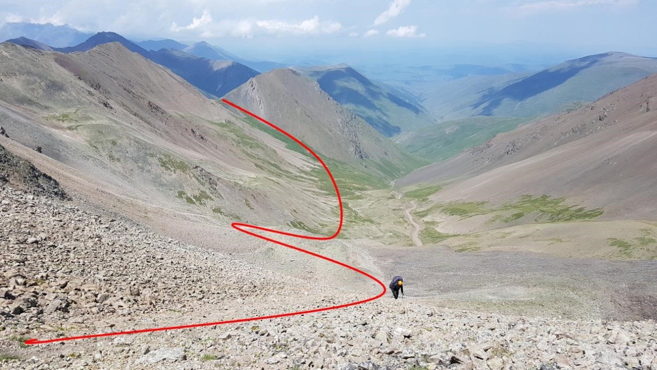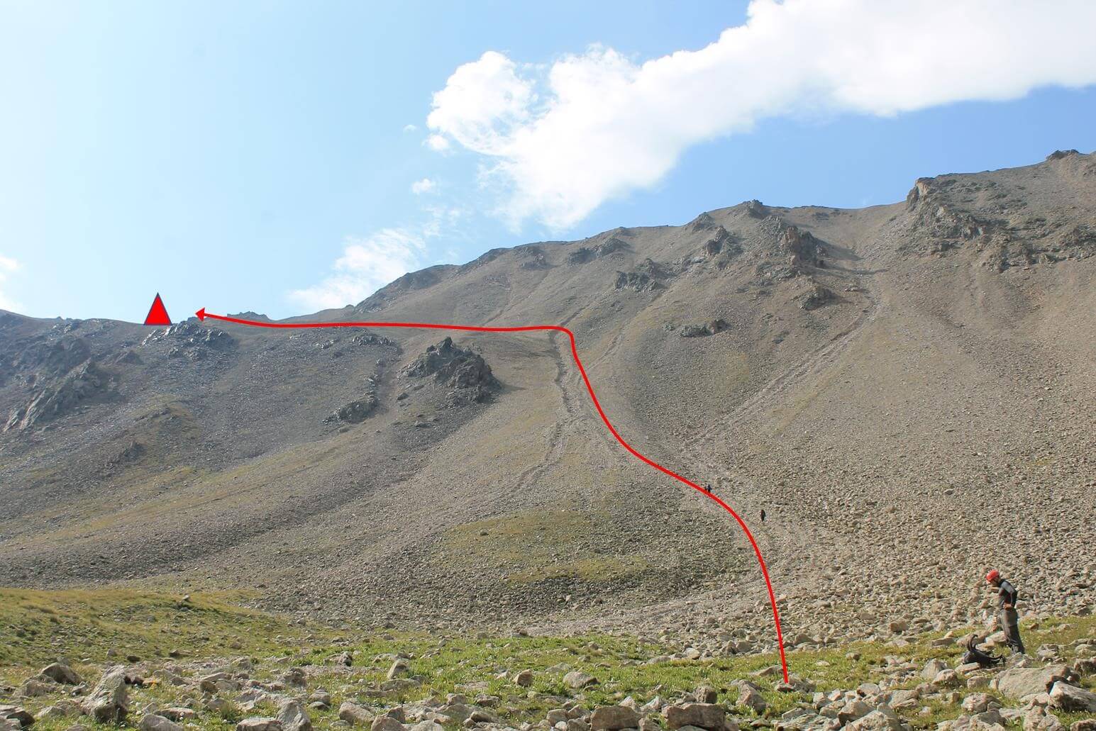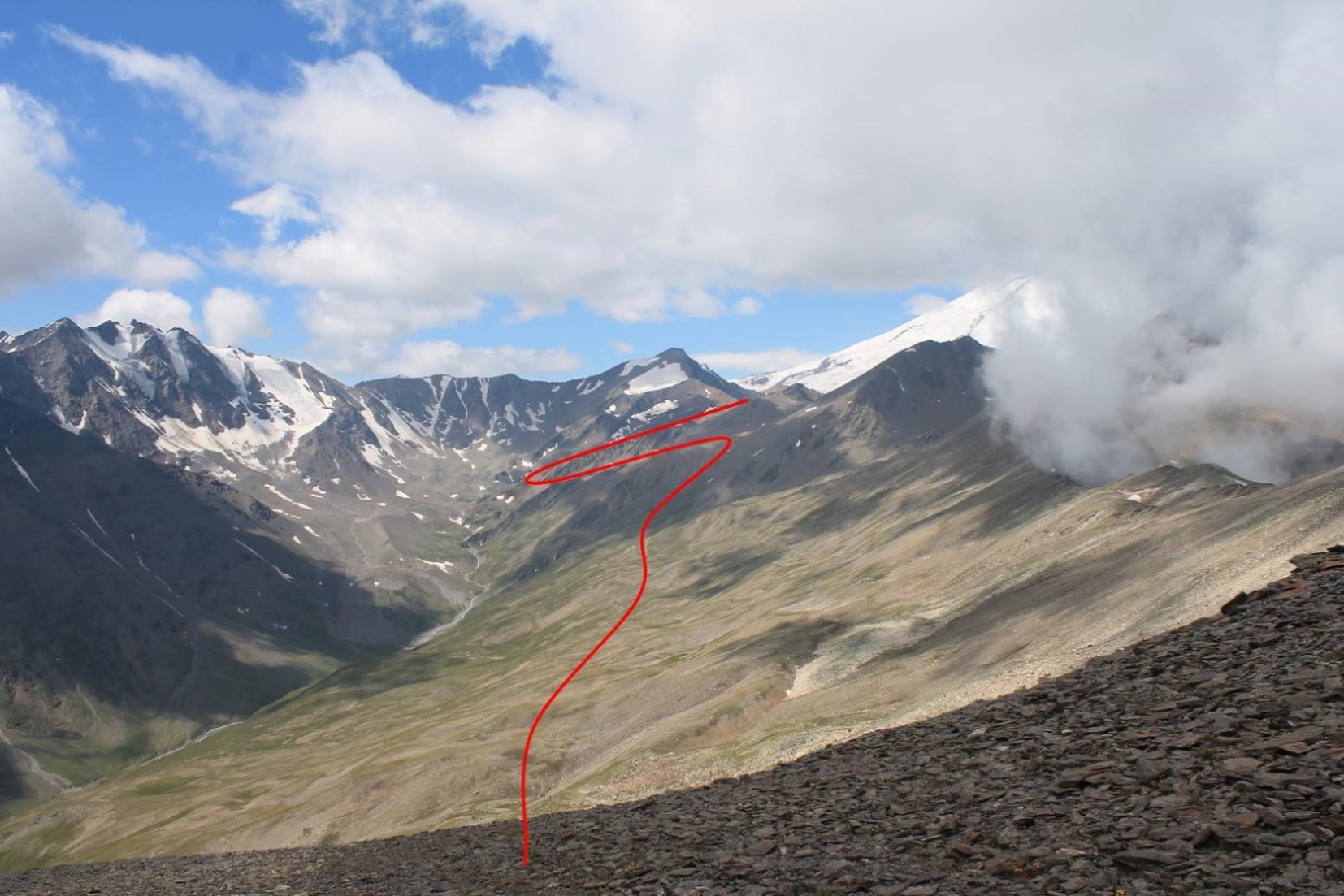 Фото 9.1 Путь подъёма на пер. ЭКТ ( 3500 м, 1Б) со стороны д.р Уллу-Кам.