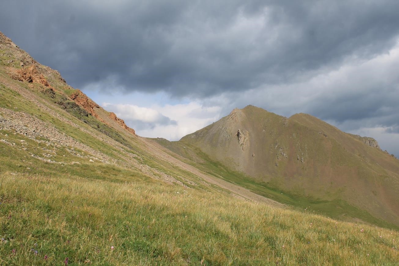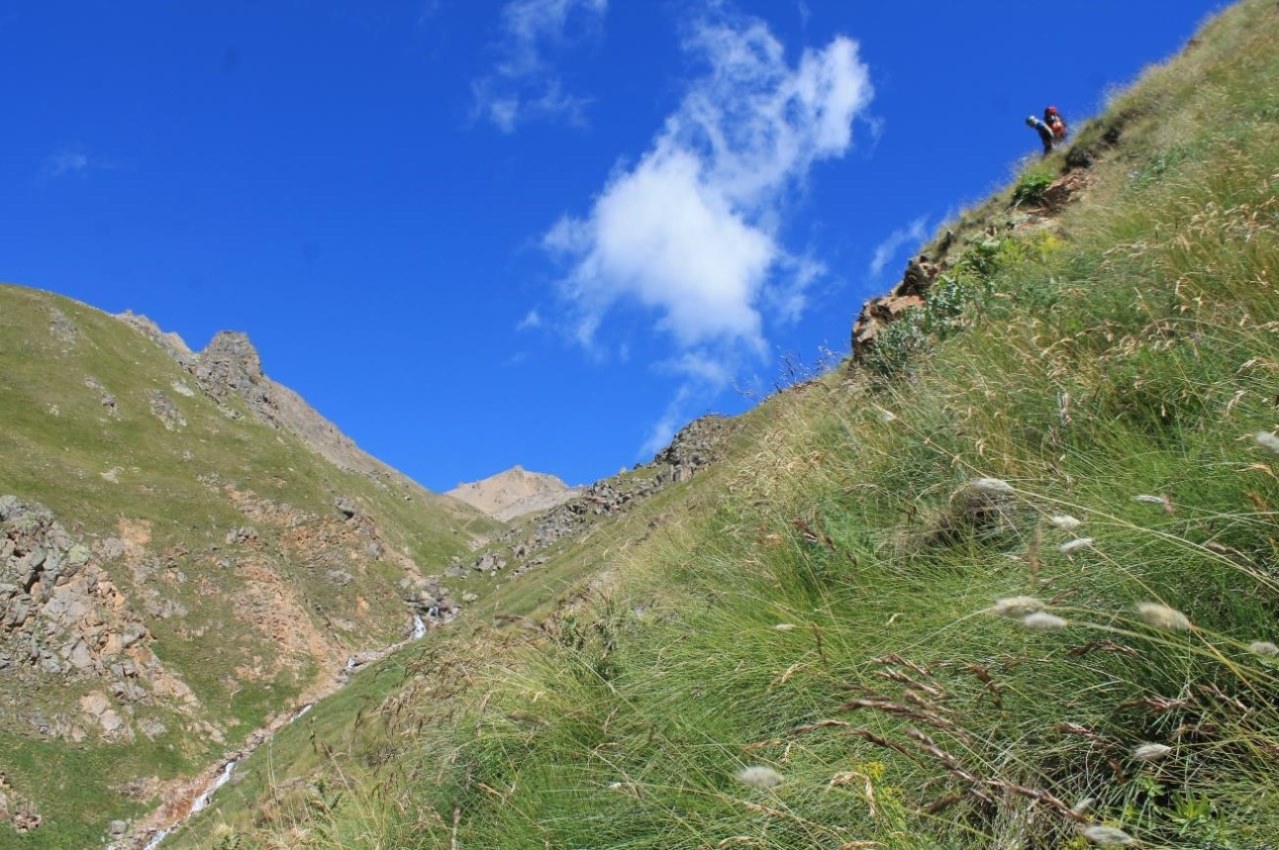 Фото 9.2 Крутой травяной склон при подъёме на пер. ЭКТ (3500 м, 1Б) со стороны д.р Уллу-Кам.