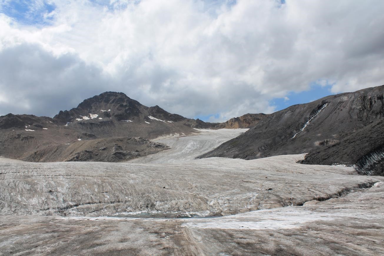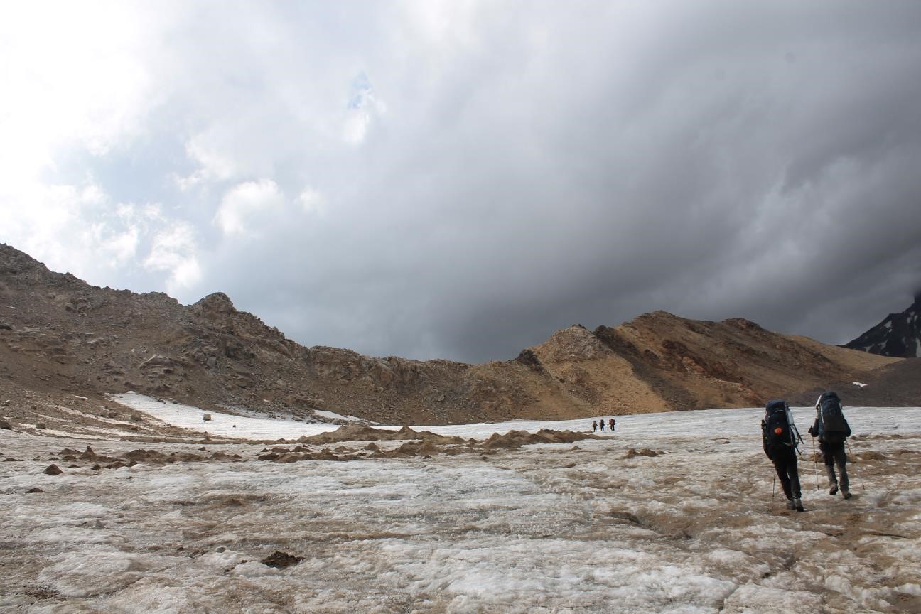 От Приюта 11 за один переход в 11.33 подходим к новой канатной дороге. Новую канатную дорогу построили в 2015 году, теперь, вместо кресел от станции Мир, туристов перевозят удобные современные вагончики, по планам в будущем хотят открыть ветку канатной дороги до Приюта 11. Старая канатная дорога находится внизу дальше по склону в 770 метров по прямой от новой станции Гара-Баши. Нам необходимо доехать до стации Мир, стоимость туристического спуска до одной станции составляет 300 рублей, билеты приобретаем в автомате, рядом со входом. Спуск по канатной дороге значительно сокращает и экономит время перехода до тропы, ведущей на Эльбрусское озеро. Спустившись до станции Мир, уходим вправо и движемся по широкой грунтовой дороге, зимой это горнолыжная трасса. Спускаемся до высоты 3100 м и сворачиваем вправо, спускаемся по конгломератному склону морены, далее пересекаем ручей, который вытекает из-под ледника Малый Азау, и в 12.00 выходим на тропу, ведущую к Эльбрусскому озеру. В нашем случае получается довольно приличный круг, т.к. необходимо спуститься ниже ледника и выйти на тропу, а это сброс 200 метров от станции «Мир» и набор 200 метров высоты от ручья. Некоторые группы проходят на ледник Малый Азау сразу от станции «Мир», тем самым экономя время и силы. Если выбирать самый надежный, простой и безопасный вариант, но более трудоёмкий, то, конечно же, это будет тропа, которая ведет на озеро от станции Новый Кругозор, по которой мы и пошли. Выйдя на хорошо набитую тропу, N 43°16.764’ E 42°27.398’, движемся до Эльбрусского озера, тропа, хорошо промаркированная на подъём всё той же синей разметкой для соревнований Alpindustria Alpine Race. В 13.00 выходим к Эльбрусскому озеру, встречаем несколько групп, одни уже становятся лагерем, другие только выбирают места под стоянки. Вода в озере мутная, но в 2014 году мы её пили после кипячения. Огибаем озеро слева по ходу движения и продолжаем наш маршрут по хорошо набитой тропе. Проходим морены, периодически встречаются ручейки с чистой водой, N 43°17.210’ E 42°26.412’. Через 750 метров от озера тропа выходит к ручью, который разделяет морену и ледник Большой Азау, N 43°17.265’ E 42°26.296’. Переходим ручей, выходим на ледник Большой Азау, ледник открыт и покрыт мелкой крошкой с разбросанными камнями. По маркировке приближаемся к скальным выходам и ледопаду в середине ледника, не доходя до ледопада, переходим по морене на его правую часть, N 43°17.267’ E 42°25.458’, откуда начинаем движение вдоль ледника на ледовый взлет (15 градусов) в цирк перевала в сужении между двух осыпных выходов рельефа. Кошки не используем, т.к. лед пористый, а ледник достаточно грязный. После выхода в цирк перевала остаётся пройти ещё 1 километр по леднику до перевального взлета. На нашем пути трещины практически не встречаются, ледник пологий, за исключением взлета в цирк перевала (15 градусов). В 15.40 подходим к перевальному взлету, начинается дождь, в правой (северной) части перевального взлёта идёт хорошая тропа. Перепад от ледника до перевала примерно 30 градусов, 70-80 метров по высоте. В 16 часов выходим на перевал Хотютау (1Б, 3546 м), N 43°17.817’ E 42°24.027’, фотографируемся, 5 минут отдыхаем и начинаем спуск. Спуск проходим по крупной и средней осыпи 400 метров по прямой, 250 по высоте и крутизной 20-30 градусов до выполаживания, далее появляется тропа, спуск становится более комфортным. Приваливаемся на площа