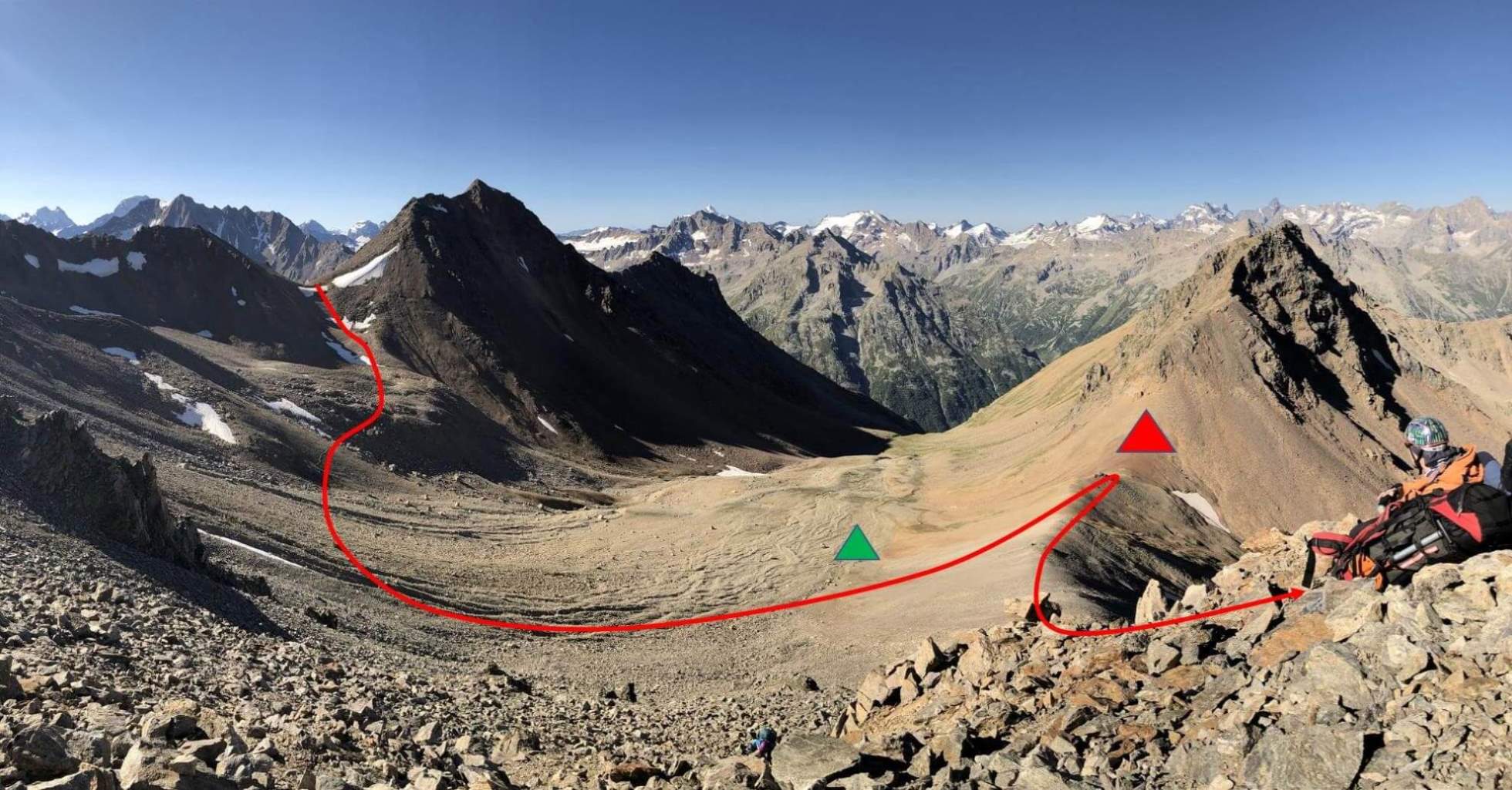 Спустившись с осыпи, продолжаем движение по траве вдоль ручья, через 1400 м подходим к осыпному взлёту, N 43°23.997’ E 42°38.198’, 3030м, высотой 120 м и 30 градусов крутизной, после которого попадаем на просторную осыпную полку на высоте 3260 м, по которой потом движемся влево по ходу движения под перевальный взлёт. Осыпная полка представляет собой морену, которая находится перед скальными выносами. По мере прохождения полки нам попадаются площадки, N 43°23.783’ E 42°38.493’, 3290 м, возможно рядом есть вода. Далее мы оказываемся перед перевальным взлётом, разделенным посередине скальными выходами. Навигатор, по координатам Вестры, указывает нам западную (правую) седловину, но более логичной выглядит восточная (левая), выбираем левую седловину и оказываемся правы. Плотной группой начинаем движение по осыпному склону крутизной 25-35. На перевале в 11.30 нас ждёт тур. N 43°23.685’ E 42°38.614’, 3396м) Склон разделяет скальный гребешок в 50 метрах от перевальной седловины, с которого можно просмотреть спуск в долину. Тропа на спуск проходить с правой стороны от гребешка. Проходим перевальный взлёт на спуск, перепад 170 м, крутизна в среднем 30 градусов, и оказываемся на морене перед началом осыпного взлета, N 43°23.511’ E 42°38.597’, ещё через переход по морене подходим к р. Уллусенчи. Перепрыгивая её по камням, оказываемся на огромной зелёной поляне, окруженной моренными валами, N 43°23.114’ E 42°38.469’, 3010 м. В 50 метрах от ручья расположены уютные площадки и камни под палатки. Время - 13.40, сегодняшняя норма по переходу и прохождению препятствий выполнена, поэтому мы встаём лагерем на полуднёвку. В ходе тяжелых раздумий один из участников принимает непростое для него решение - сойти с маршрута по семейным обстоятельствам. Сожалея, мы принимаем его решение и на следующий день рано утром провожаем его до грунтовой дороги д.р. Субаши. Фотоматериалы: