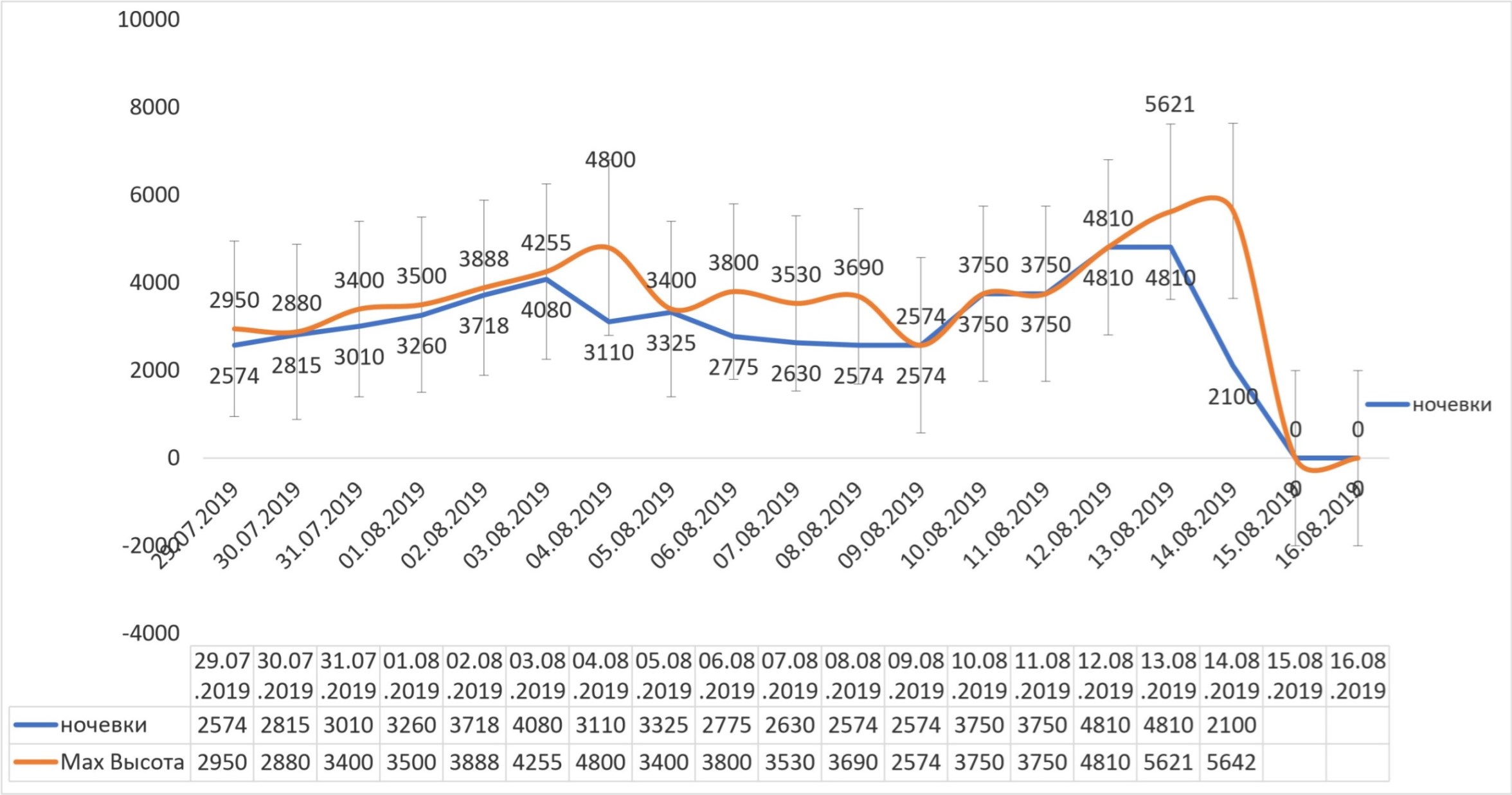 Поход оказался бюджетным по сравнению с походами аналогичной категории сложности по средней Азии. С учетом билетов на поезд итоговая стоимость не превышала 20 т. р., с учетом личных трат участников - не более 25 т. р. Сокращения и понятия, принятые в отчёте Понятия «левый» и «правый» даны в орографическом смысле, если не указано иное. Координаты приведены в системе WGS 84. Указано чистое ходовое время, если не указано иное. Произведено округление до 5 минут. Чистое ходовое время (далее - ЧХВ) дано по последнему участнику, от привала до привала, с учётом времени переправ, разведку троп и мест ночёвок и т.п., если не указано иное. В походе использованы 2 верёвки длиной 40 м. Центральный Кавказ горный 2 к.с. рук. Лохин Д. Б. 2019 г. Высотный график