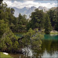 Малое Алаудинское озеро в арчовых зарослях. Вдали виден Зеравшанский хребет.