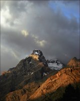 Подсвеченная вечерним солнцем вершина Бодхоны в облаках. Вид из ущелья реки Бодхона.