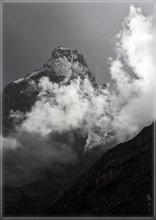 Вершина Чапдары в облаках. Вид из ущелья реки Бодхона